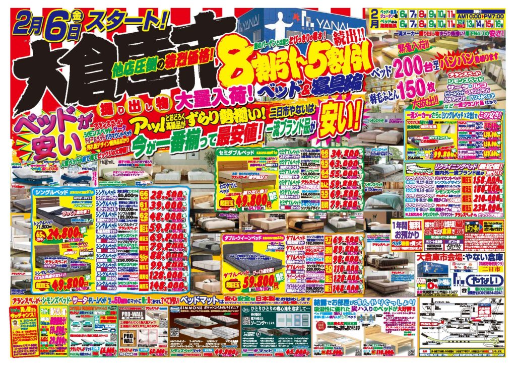 今回の大倉庫市の目玉は、「ベッドフェア」です。シモンズ・フランスベッド・サータといった有名ベッドメーカーの最大80%OFFのベッドセールも同時開催。全200台のベッドを実際に寝比べていただけるため、ご自身の体に本当に合ったマットレスを見つけていただけます。さらにギャッベをはじめ、シルクのペルシャ絨毯、パキスタン絨毯など、世界各国の絨毯を最大60%オフでお買い得セールとなっております。そのほか、羽毛布団や毛布などの季節商品も新春特別価格にてご用意しております。寝具を新調するには、まさに今がチャンスです。この機会に、ぜひご来店くださいませ。スタッフ一同、心よりお待ちしております。