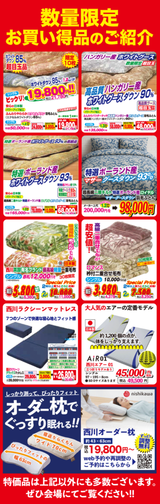 感謝の気持ちを込めて、この冬はあったか寝具をどーんと大放出させていただきます!西川をはじめとした一流人気メーカー協賛の羽毛掛ふとんをたっぷりご用意しました。
